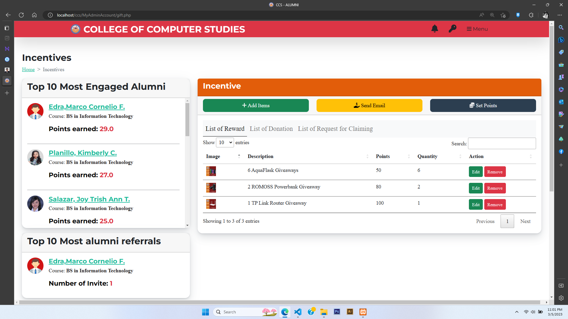 This system serves as the student thesis project for the bachelor of science in information systems. A program used by the College of Computer Studies to track down alumni growth. With a extra feature like : Reward and points System, chat feature, and gis mapping.