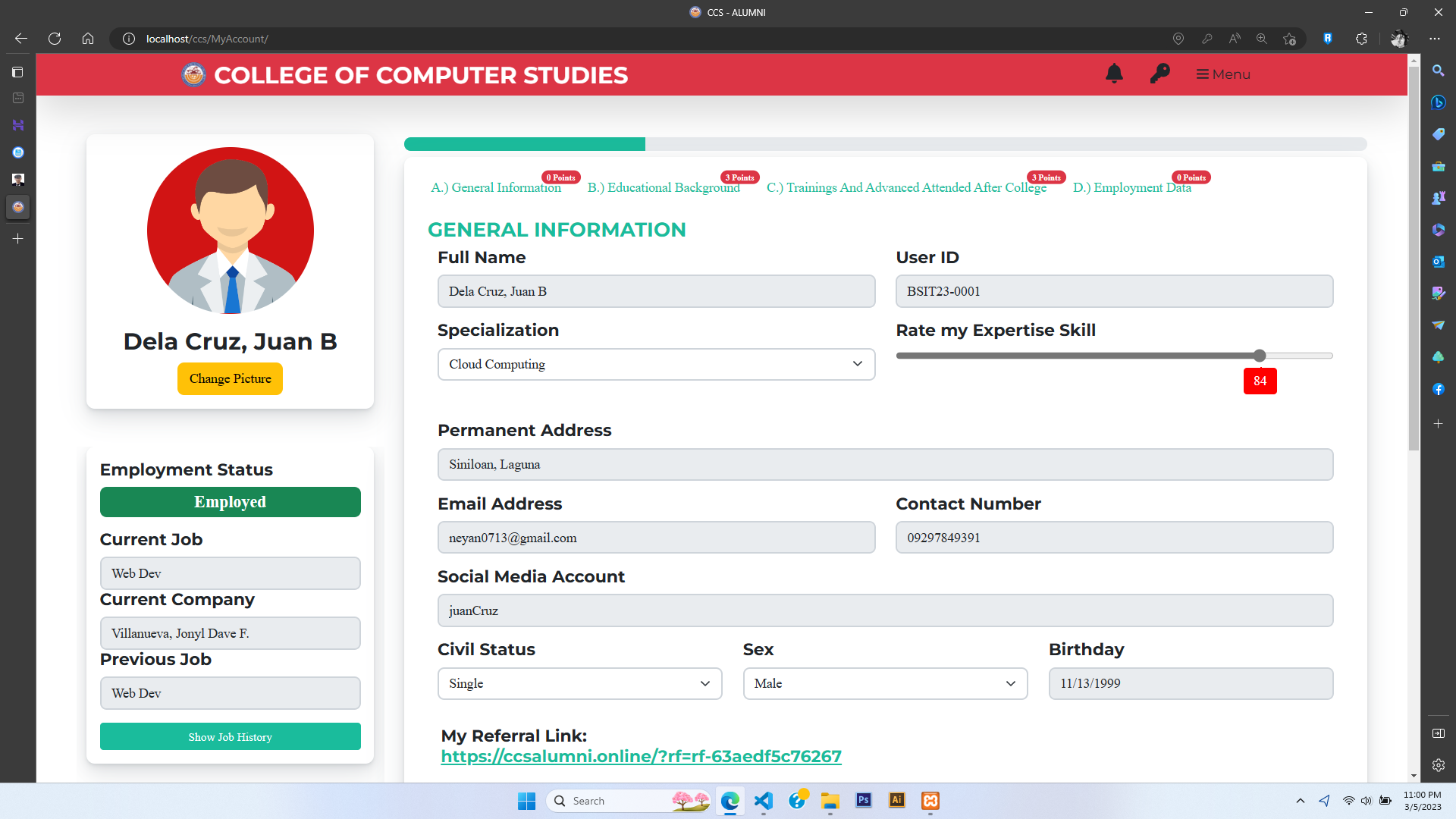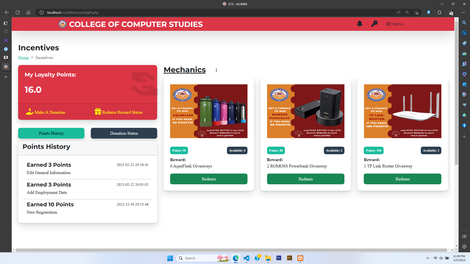 This system serves as the student thesis project for the bachelor of science in information systems. A program used by the College of Computer Studies to track down alumni growth. With a extra feature like : Reward and points System, chat feature, and gis mapping.